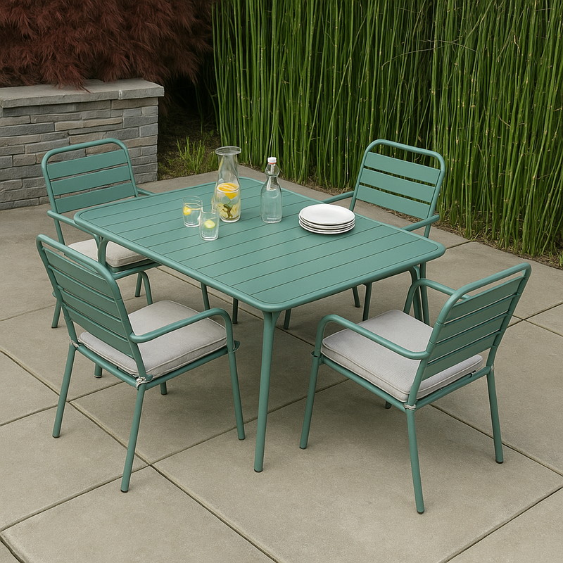 Smooth 屋外用パティオダイニング 5点セットは、目を引くグリーンのパウダーコーティング仕上げが特徴です。スタイルと実用性を自然に融合させ、ガーデンパーティー、家族でのディナー、太陽の下でのカジュアルな朝食に最適です。