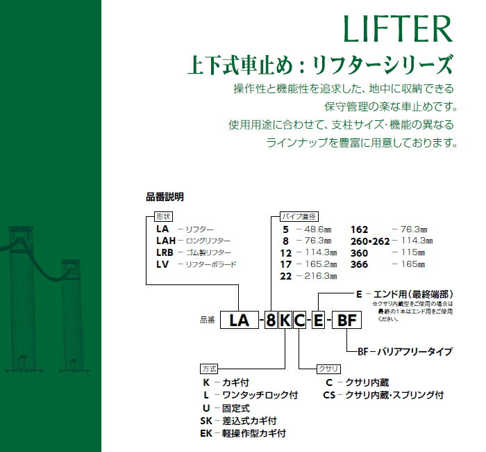 商品名 車止めポール【アルミヘッドリフター φ76.3 セラミック塗装 差込式カギ付 クサリ内蔵(2m) LV-162SKC】 車庫まわり 駐車場 ガレージ 車止め カーストッパー