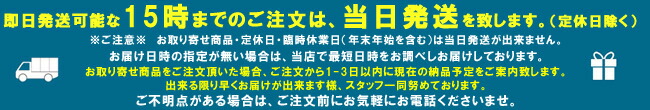 | ※当店は実店舗と平行して営業しております。申し訳ございませんが、実店舗で完売した商品の在庫数の反映に若干お時間がかかることがあります。 ※撮影状況、又PCなどの環境によっても実際の商品とは色合いなどに誤差が生じる場合がございますので予めご了承下さい。 |