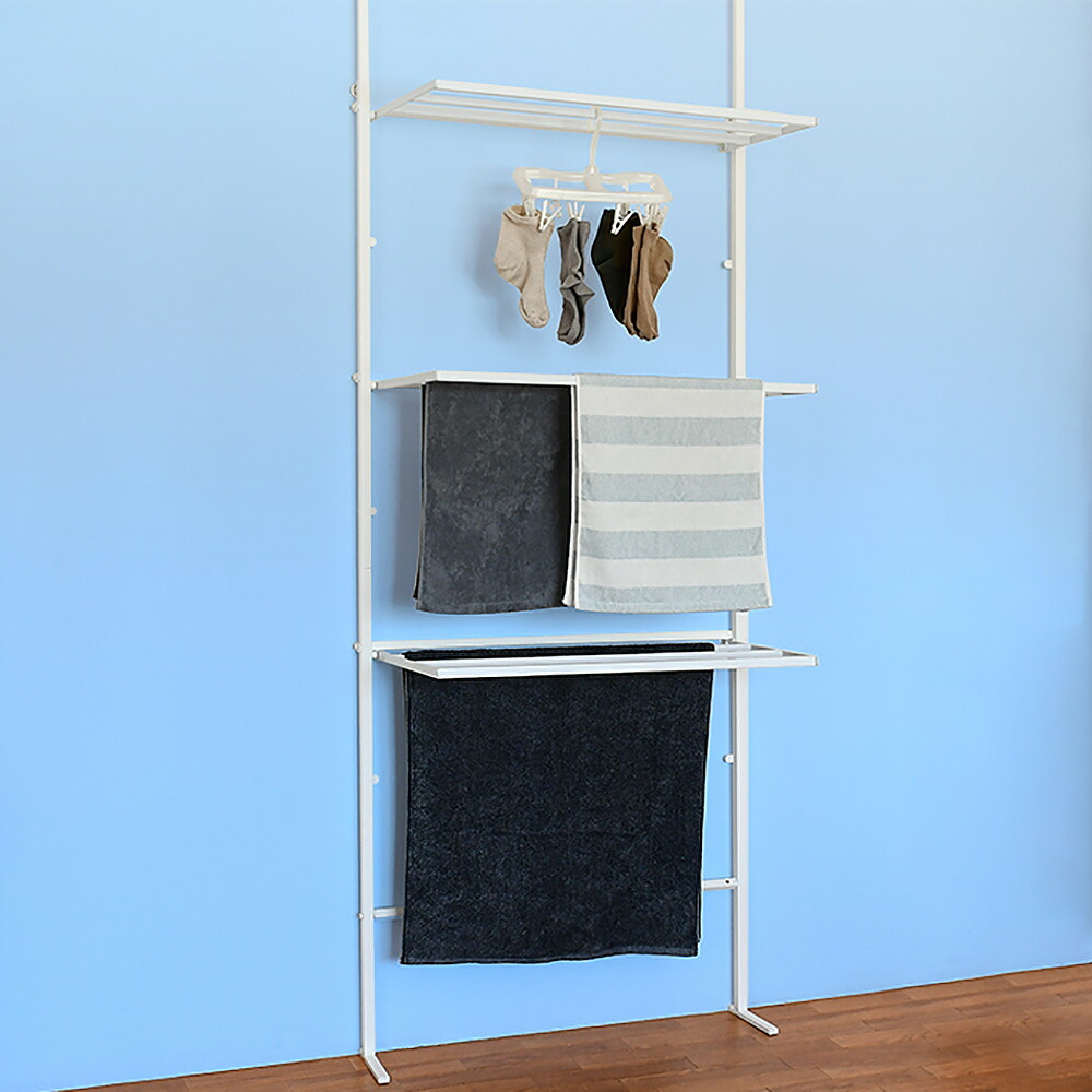 突っ張り式の室内用ハンガー。 ハンガー部分が折りたたみ式で使わない時はパタンと閉じておけば、ボーダーパーテーションとして使うこともできます。 ハンガーは3段に分かれているため洗濯物を種類ごとに分けて干すのにも便利です。