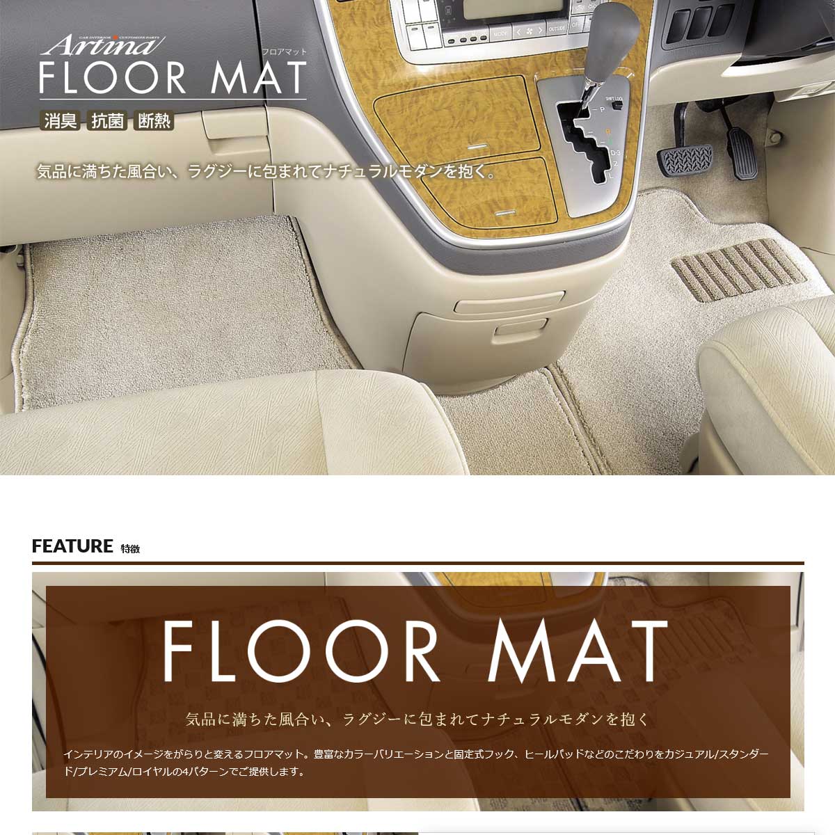 | ■商品説明 | 気品に満ちた風合い、ラグジーに包まれてナチュラルモダンを抱く インテリアのイメージをがらりと変えるフロアマット。豊富なカラーバリエーションと固定式フック、ヒールパッドなどのこだわりをカジュアル/スタンダード/プレミアム/ロイヤルの4パターンでご提供します。 ◆選べる4種類のフロアマット アルティナフロアマットはカジュアル、 スタンダード、プレミアム、ロイヤル の4種類をラインナップ。 カラーも豊富にご用意しているので 必ずお好みのフロアマットをお選び いただけます。 フロント用にはアルティナエンブレムが付属します。※有り無し設定可能 ◆車種別の固定方式 トヨタ車に関して原則固定式フック、回転ノブ式ストッパーなど純正の固定方式に対応しています。トヨタ車以外は固定用金具は付属しておらず、純正フックがある前提の固定方法や固定方法の変更(マジックテープ式)で対応しております(※純正フックを外して固定する場合もあります)。 ◆背面ラバー 背面ラバーは耐久性を高め、しっかりグリップし、滑りを抑えます。 ◆ヒールパッド 運転席側のヒールパッドが汚れや頻繁な摩耗を抑えます。 |